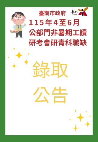 用人單位:臺南市政府研究發展考核委員會研展暨青年事務科 面試時間:115年3月18日14時、3月20日16時30分及3月23日14時 錄取名單: 正取1名:陳○伃 備取1名:劉 ...更多