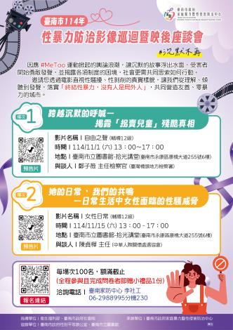 為增進社會大眾對於性騷擾、兒少性剝削等暴力議題之防治意識及知能,爰規劃辦理性暴力防治影像巡迴影展,藉由性暴力議題影片賞析,並透過映後座談會進行互動討論,進一步認識性暴力防治。活動資訊如下: (一 ...更多
