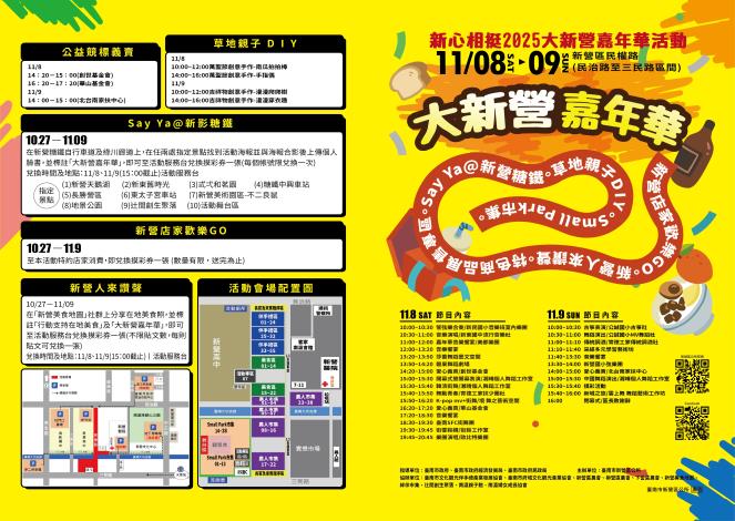 2025大新營嘉年華隆重登場 一、活動時間:114年11月8日~9日。 二、活動地點:新營民治路至三民路區間。 三、今年有七大主題活動 (一)台南特色商品展售 (二)新營 ...更多
